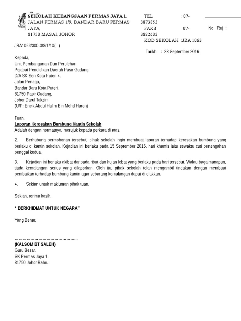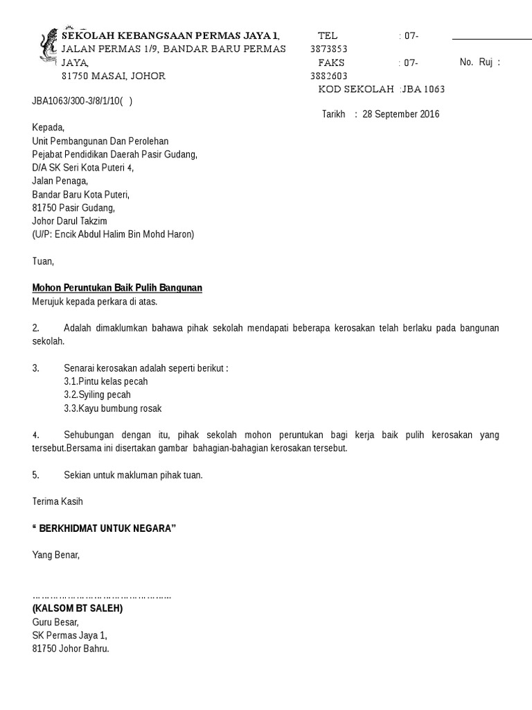 Untuk anda yang berprofesi sebagai seorang guru dan ingin mengambil cuti untuk liburan. Rina rosdiana ratu ular tempat, tanggal lahir : Surat kiriman rasmitulis sepucuk surat kepada jabatan kerja raya memberitahumasalah kerosakan jalan raya yang menuju ke kampung kamu.d47a, blok 11,jalan melati… 3 mei 2005.tuan,aduan kerosakan jalan raya di jalan melatisaya mewakili penduduk kampung melati. Surat rasmi aduan kerosakan kemudahan awam. Contoh surat tugas dinas dan surat tugas guru via www.belajaroffice.com.